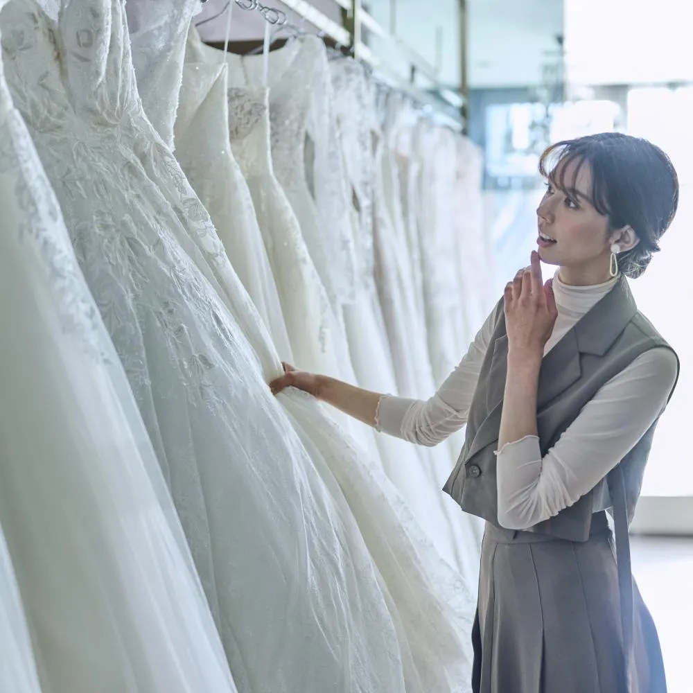館内ショップ「DESTINY Line」を専属スタイリストがご案内。ユミカツラやハツコエンドウ、キヨコハタもありトレンドに敏感な花嫁も満足のラインナップ!ヴェラウォン等有名インポートブランドもご用意。
